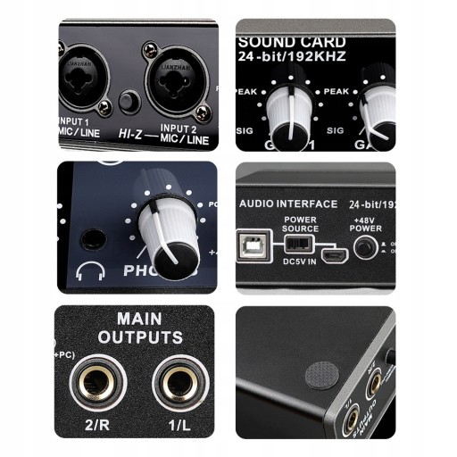Przedwzmacniacz mikrofonowy 2x2, z potężną funkcją i kompatybilnością oraz szybkim interfejsem USB2.0 i rozdzielczością audio 24 Bit/192 Khz, może zapewnić doskonałą jakość nagrywania, bardzo odpowiedni do nagrywania mikrofonu, gitary, basu, komputerów i innego sprzętu.