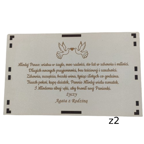 Nasza drewniana koperta na pieniądze z pewnością mocno ucieszy i będzie ciekawą formą pamiątki. Do środka, włóż banknoty, a wydrukowane życzenia wewnątrz koperty zastąpią klasyczną papierową kopertę.