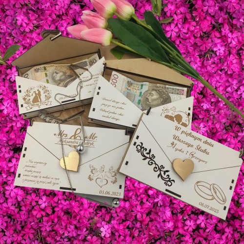 ELEGANCKA, DREWNIANA KOPERTA NA PIENIĄDZE - PREZENT ŚLUBNY - PERSONALIZOWANE ŻYCZENIA