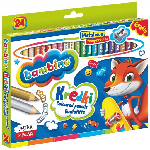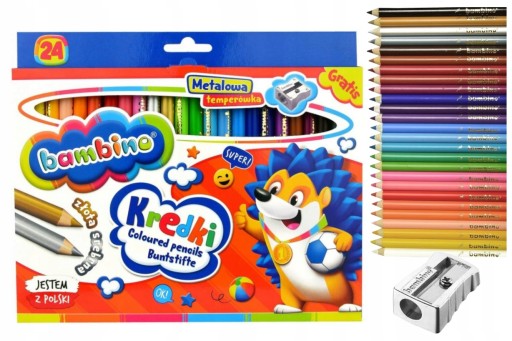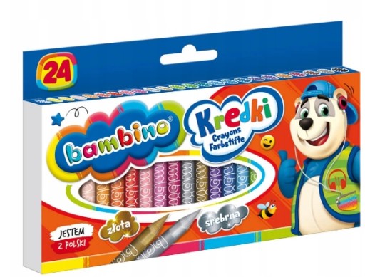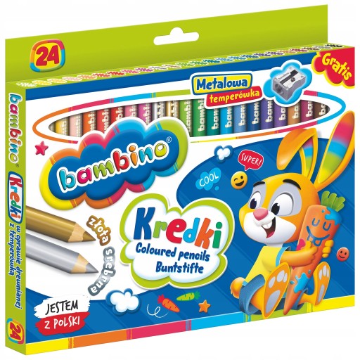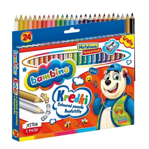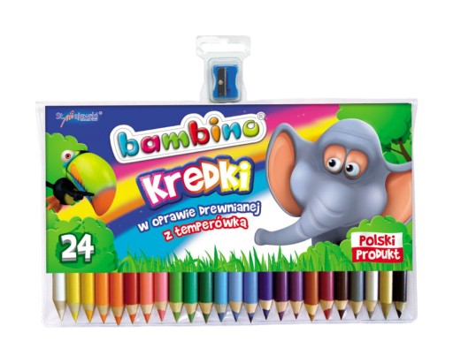 Wysokiej jakości kredki z glinki kaolinowej w drewnianej oprawie. Charakteryzują się wyjątkowo intensywnymi i nasyconymi kolorami. Doskonale kryją, idealnie nadają się do rysowania, wypełniania dużych powierzchni i wykonywania miękkich przejść pomiędzy kolorami. Kredki są grube, odpowiednio wyważone, przez co idealnie dopasowują się do małej dłoni dziecka. Produkowane są w Polsce, w zgodności z dyrektywą Parlamentu Europejskiego i Rady w sprawie bezpieczeństwa zabawek oraz rozporządzeniem Ministerstwa Gospodarki w sprawie zasadniczych wymagań dla zabawek, co gwarantuje bezpieczeństwo kredek Bambino. Licencja - Bambino, ilość kolorów - 24, ilość sztuk w opakowaniu - 24, cechy szczególne - kredki o przekroju 7 mm z temperówką w zestawie.