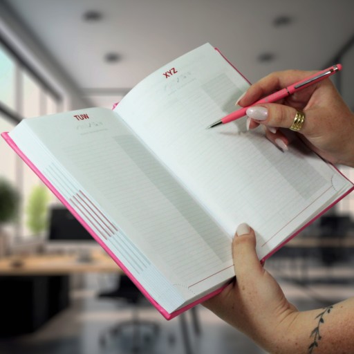Bardzo dobrej jakości kalendarze drukowane i składane w Polsce, w oprawie typu Vivella. Format A5 (14,5 x 20,5 cm), 360 stron, układ dzienny (sobota i niedziela na jednej stronie), barwna i miękka okładka, indywidualny nadruk tworzony na podstawie przesłanego pliku graficznego - wektorowego tzw. krzywe (przykładowy format zapisu: .eps, .ai, .cdr, .svg, .pdf).