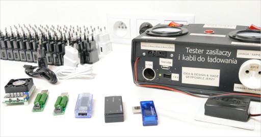 Na zdjęciu powyżej pokazaliśmy nasz autorski tester zasilaczy i kabli do ładowania, a także kilka urządzeń pomocniczych, służących do obciążania ładowarek i pomiarów napięcia, prądu i mocy. Dzięki skrupulatności i zaangażowaniu, oferujemy w sprzedaży FAKTYCZNIE przetestowane akcesoria do ładowania telefonów i tabletów.