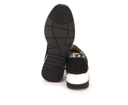 Damskie półbuty typu sneakersy marki Gregors. Cholewka, środek i wkładka wykonane z najwyższej jakości skóry naturalnej. Kawałek wewnątrz, za piętą, wyłożony materiałem tekstylnym. Grubość podeszwy z tyłu to 4,5cm. Ozdobione srebrnymi detalami.