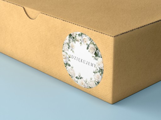 Przedmiotem oferty są okrągłe samoprzylepne naklejki z motywem białych róż.