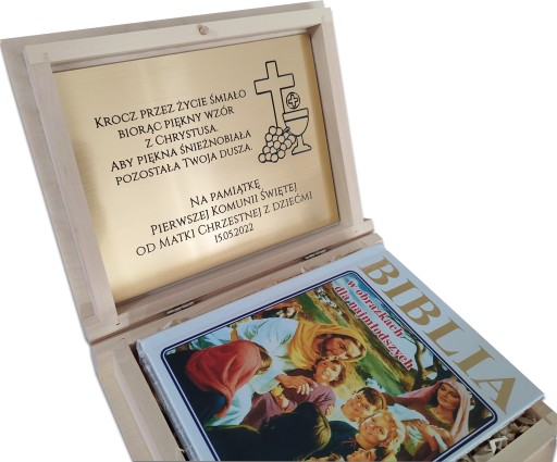 Oferujemy biblię w szkatułce ze spersonalizowanym grawerem. To upominek, który zostanie w pamięci na długi czas,a estetycznie wykonana szkatułka będzie stanowiła piękną ozdobę na długie lata.