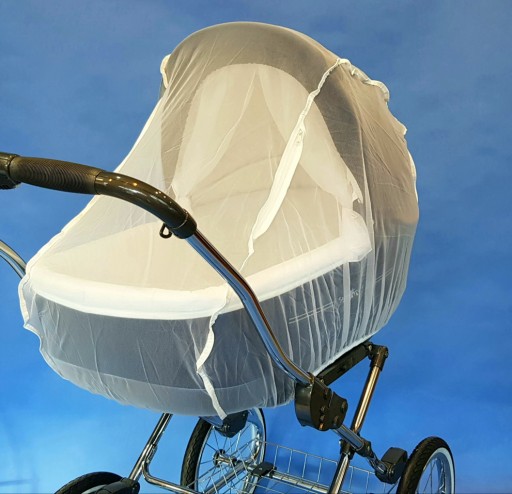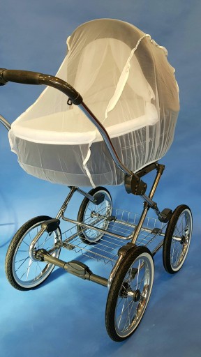 Moskitiera założona na wózku klasycznym, na gondoli i spacerówce.