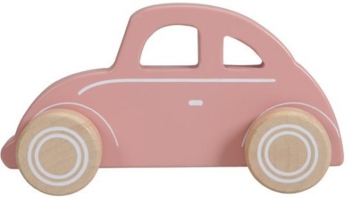 Drewniany samochodzik od Little Dutch w odcieniu brudnego różu z kółeczkami w kolorze naturalnego drewna.