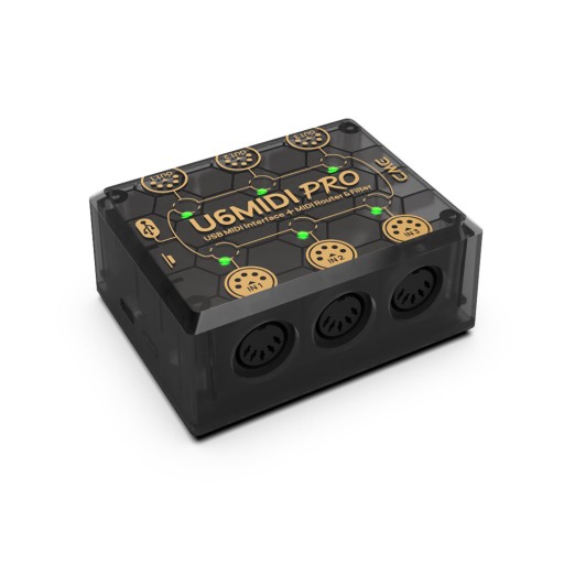 U6MIDI Pro zapewnia standardowe 5-pinowe porty MIDI w 3 MIDI IN i 3 MIDI OUT, obsługuje łącznie 48 kanałów MIDI i jest zasilany przez standardową magistralę USB lub zasilacz USB.