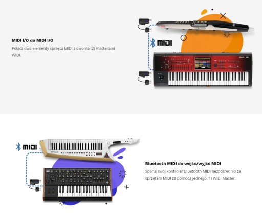 Do dwukierunkowego podłączenia urządzeń MIDI potrzebne są dwa Master y WIDI. Jeżeli planowane jest połączenie pomiędzy kontrolerem MIDI a urządzeniem Bluetooth (np. laptopem lub kontrolerem Bluetooth MIDI), wystarczy tylko jeden master WIDI.