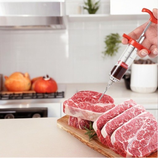 - Bardzo łatwa w użyciu. Wystarczy napełnić strzykawkę przyprawami / marynatą i wstrzyknąć zawartość w mięso z pomocą jednej z igieł.