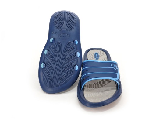 Męskie klapki marki Atletico. W całości wykonane z tworzywa sztucznego. Ozdobione jasnoniebieskimi detalami Idealnie nadają się na basen czy plażę oraz do innych, letnich stylizacji.