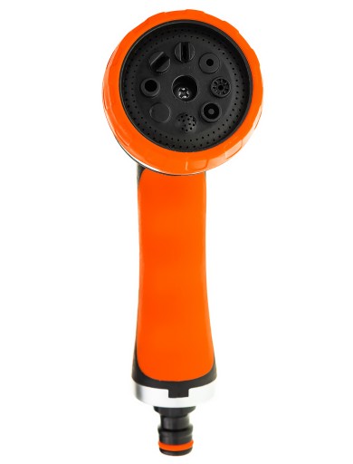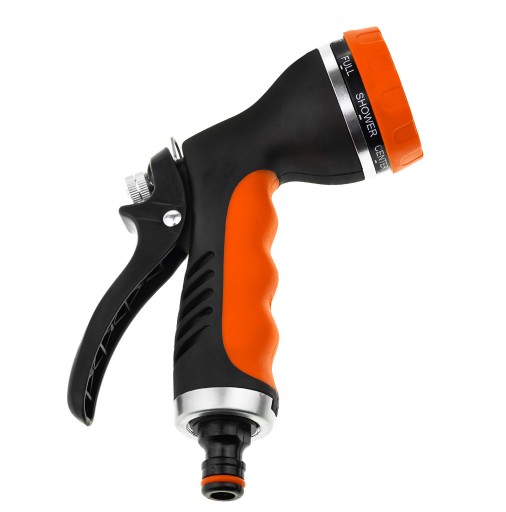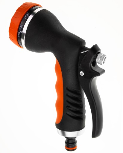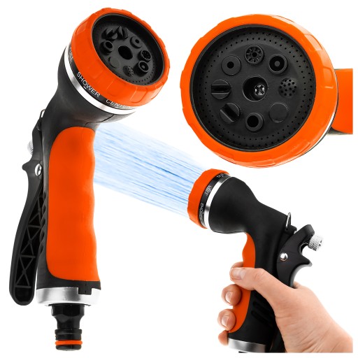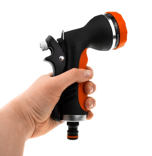 Wysokiej jakości pistolet zraszający wielofunkcyjny - 8 rodzajów strumienia z regulacją przepływu. Dobrze wyważony, idealnie trzyma się w dłoni. Posiada tryb pracy ciągłej.