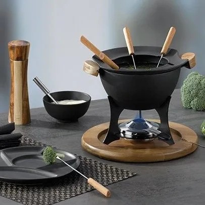 Żeliwny zestaw do fondue dla sześciu osób na drewnianej podstawce.