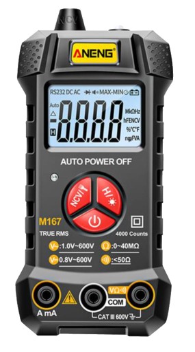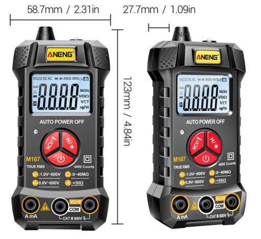 Kompaktowy multimetr cyfrowy smart (smart) ANENG M167 to urządzenie pozwalające na dokładny pomiar wartości, które są wykorzystywane w diagnostyce i naprawie różnego rodzaju elektroniki. Ten multimetr cyfrowy mierzy rzeczywistą średnią kwadratową (True RMS), automatycznie wyszukuje zmierzoną wartość i wybiera wymagany zakres.