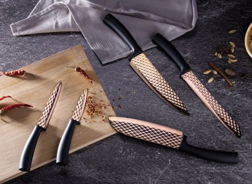 Zestaw noży kuchennych ze strukturą ostrza 3D. Dzięki zmniejszeniu powierzchni kontaktu ostrza z krojoną żywnością krojenie staje się łatwiejsze. Różnica szczególnie odczuwalna przy krojeniu serów, wędlin i mięs. Komplet z linii Rose Gold firmy Berlinger Haus.