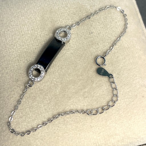 Bransoletka srebrna próby 925 z ozdobnym łańcuszkiem połączonym z czarnym elementem z ceramiki i cyrkoniami.