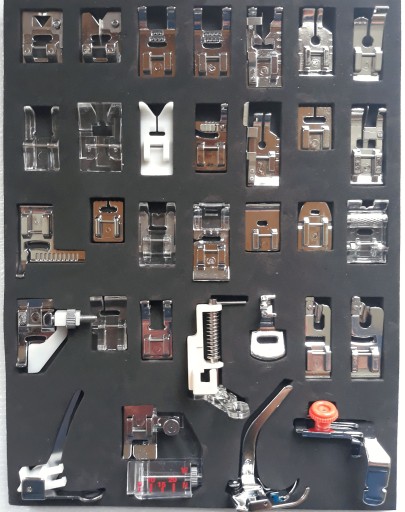 Zestaw ten obejmuje 32 stopki z różnymi funkcjami, takimi jak stopka do zamka, stopka do sznurowania i stopka do rolek.