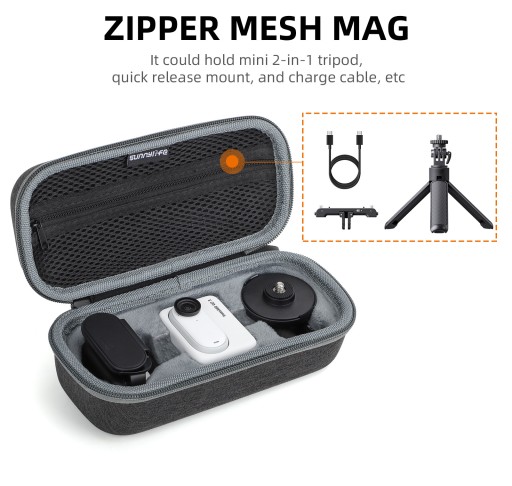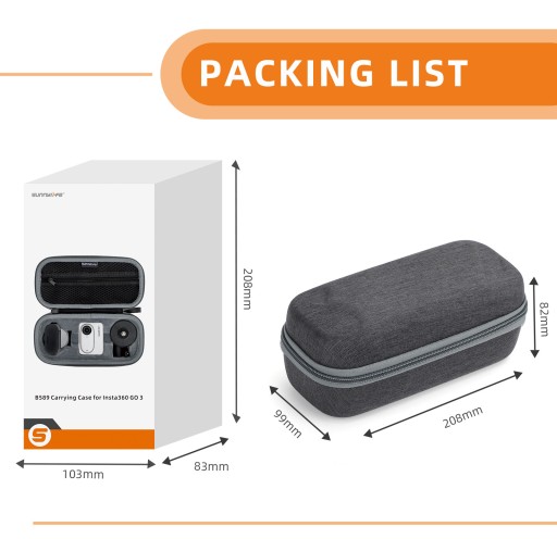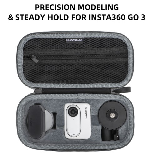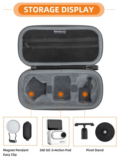Może pomieścić kamerę GO 3 + komorę rozszerzeń, wspornik kierownicy, smycz magnetyczną, prosty klips, mini statyw do selfie stick, magnetyczne akcesoria do szybkiego zwalniania, kable do ładowania i inne akcesoria.