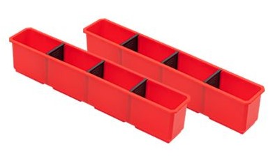 Organizer XL Long Bin jest wyposażony 4 podłużne kubełki. Każdy z nich zawiera 3 wyjmowane przegrody pozwalające na dowolną organizację ich wewnętrznej przestrzeni. To jedyny taki organizer na rynku, który pozwala na transport i przechowywanie elementów do 50 cm ich długości.