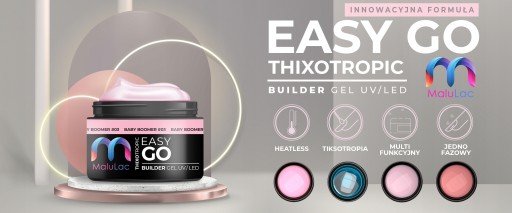 Żel z tiksotropią EasyGo MaluLac charakteryzuje się gęstą konsystencją przypominającą budyń oraz wytrzymałością porównywalną do akrylu. Z powodzeniem utrzyma się na paznokciach nawet przez 4 tygodnie. Szybkość pracy, duża wszechstronność oraz wytrzymałość tego żelu sprawiają, że stanowi obowiązkowy produkt w kuferku każdej stylistki paznokci!