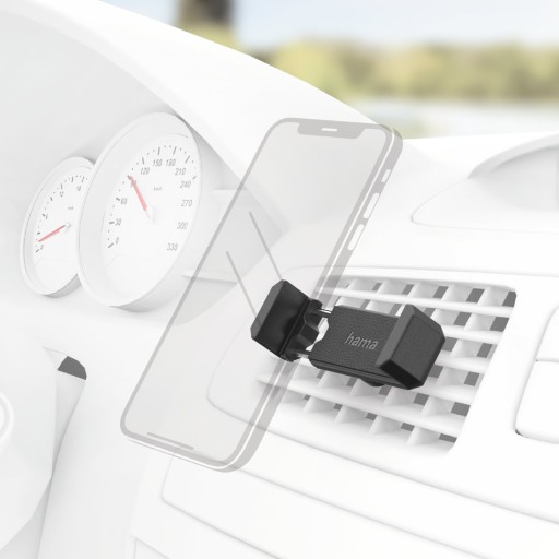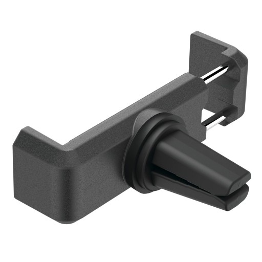 Kompaktowy uchwyt samochodowy do telefonu mocowany na kratce wentylacyjnej pojazdu.