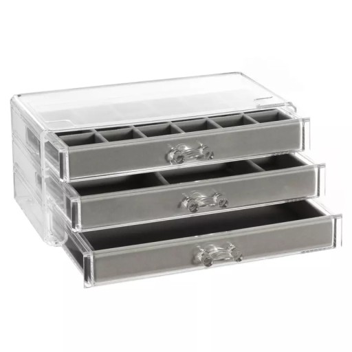 - 3 szufladki, w każdej 18 przegródek z wyjmowanym szarym, welurowym organizerem, wyciągana kratka,