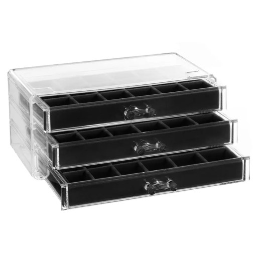 - 3 szufladki, w każdej 18 przegródek z wyjmowanym czarnym, welurowym organizerem, wyciągana kratka,