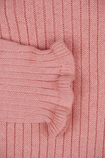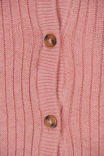 Nowy Kardigan marki George. Z dzianiny prążkowanej w odcieniu palonego różu. Z przodu zapinany na guziki. Dekolt okrągły. Sweter na długi rękaw. Rękawy oraz dół swetra zakończone falbankowym ściągaczem. Kardigan wykonany z ekologicznej bawełny.