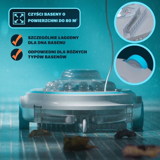 Bezprzewodowy odkurzacz basenowy działa tylko na ziemi - podczas czyszczenia możesz bez przeszkód pływać w basenie bez plątaniny kabli. Dzięki dużej przepustowości wynoszącej 80 l/min masz wystarczającą moc, aby wyczyścić powierzchnię do 80 m². W zestawie znajduje się stacja ładująca i siatka filtracyjna ze stali nierdzewnej.