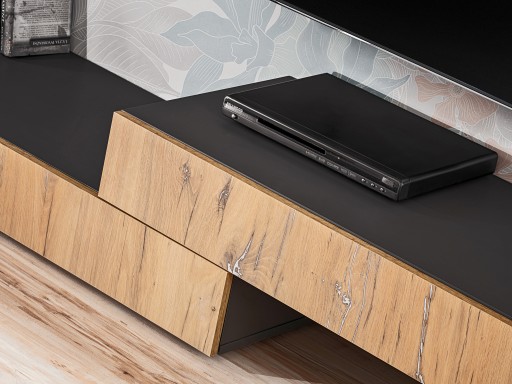 - STYL LOFT: Prosta, geometryczna forma świetnie prezentuje się w nowoczesnych i industrialnych wnętrzach. Fronty w kolorze dębu bijoux i antracytu, inspirowane naturą, dodają elegancji.
