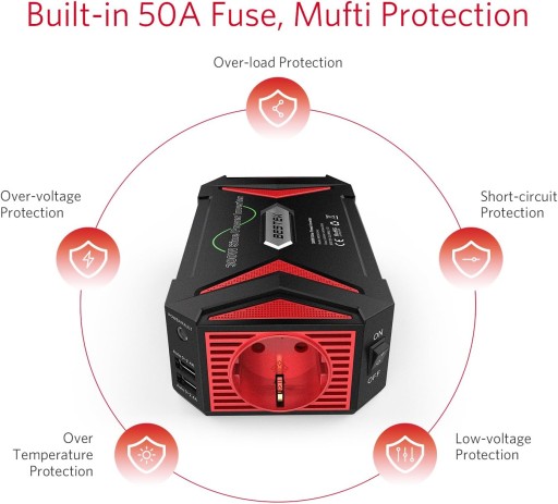 - Bezpieczny w użytkowaniu: Wbudowany wentylator przez większość czasu pozostaje wyciszony, dzięki czemu ciepło jest automatycznie odprowadzane po przekroczeniu określonej temperatury. Zabezpieczenie przed przeciążeniem, przepięciem, zbyt niskim napięciem, przegrzaniem i zwarciem. Ostatnie ulepszenie dotyczy mocowań wewnętrznych