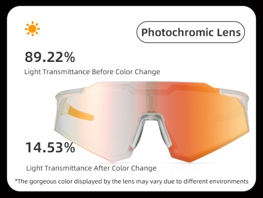 Soczewka fotochromowa wykonana z materiału PC jest w 100% odporna na promieniowanie UV400 i może blokować szkodliwe promienie UAV i UAB. Podczas jazdy w silnym świetle słonecznym okulary samoistnie przyciemniają się dzięki czemu skutecznie chroniąc oczy i zapewniają komfort użytkowania. W zestawie znajdują się dodatkowe oprawki na szkła korekcyjne oraz praktyczne etui.