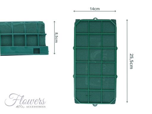 Ta prostokątna podstawka ma wymiary 25,5 cm x 14 cm x 8,5 cm i idealnie wpasuje się w Twoje potrzeby. Gąbka o wymiarach 24 cm x 11,5 cm x 8 cm jest wykonana z wysokiej jakości materiału, który doskonale wchłania wodę i zachowuje swoje właściwości nawet podczas cieplejszych dni. Kolor gąbki i garnetu to zielony - żywy i atrakcyjny dla oka.
