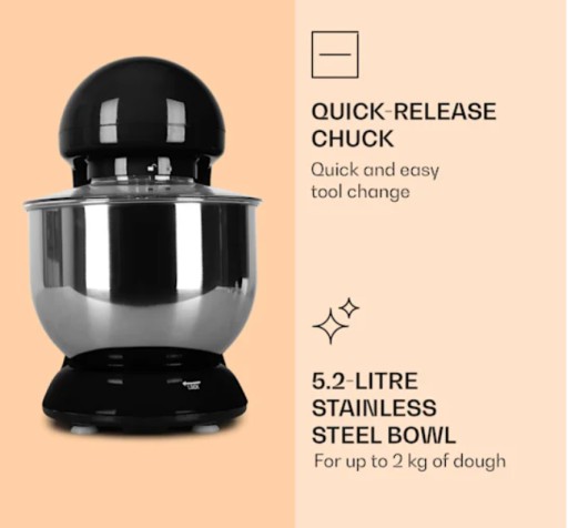 W dostawie 5,2 litrowa miska ze stali nierdzewnej i 3-częściowy hak do mieszania i zagniatania oraz trzepaczka do ubijania piany.
