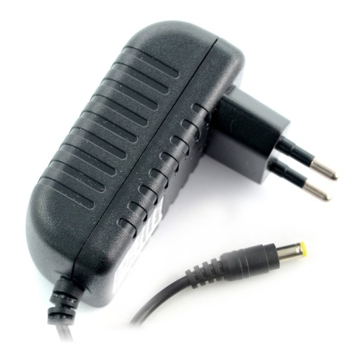 Stabilizowany zasilacz sieciowy. Napięcie zasilania: od 100 V do 240 V. Napięcie wyjściowe: 12 V DC. Prąd wyjściowy: 3 A. Złącze: wtyk DC 5,5 / 2,5 m.