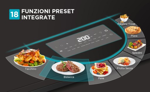 Dzięki 18 wstępnie ustawionym funkcjom za pomocą jednego przycisku możesz smażyć na powietrzu, piec, smażyć, grillować, pieczeć, odwodnić, podgrzewać i rotisserie, tworzyć wszelkiego rodzaju potrawy we własnej kuchni. Cyfrowy wyświetlacz jednym dotknięciem oferuje 18 ustawień wstępnych, a także dołączoną książkę kucharską testowaną, ułatwiającą gotowanie.