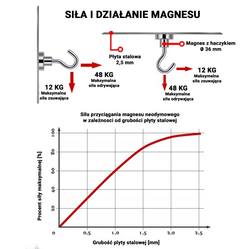 Podana siła udźwigu została zmierzona przy odrywaniu prostopadłym od kilkumilimetrowej płyty stalowej. Uwaga! Inną siłę będzie miał haczyk przymocowany do sufitu, a inną do ściany. Kluczowa jest też grubość materiału, do którego został przymocowany uchwyt, dlatego sugerujemy przetestować magnes w danych warunkach.