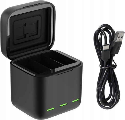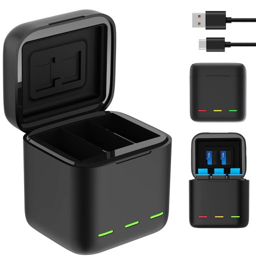 - Ładowarka może ładować jednocześnie trzy akumulatory za pomocą adaptera USB. Jednoczesne pełne naładowanie 3 baterii zajmuje tylko około 2,5 godziny. Zaoszczędź więcej czasu ładowania i ciesz się przyjemniejszym nagrywaniem wideo.
