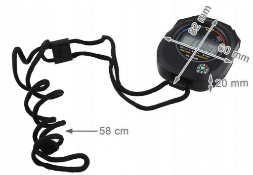 ✅ SPECYFIKACJA – dokładność pomiaru czasu: 1/100 sekundy, zasilanie: 1 x AG13 (w zestawie), wymiary (dł/szer/wys): 8,2/6/2 cm, długość sznurka: 58 cm, waga: 50 g.