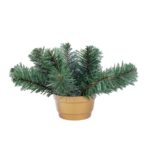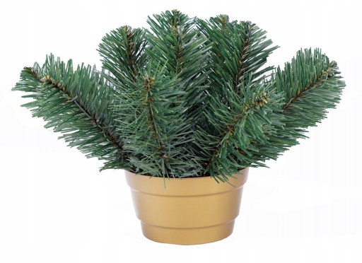 Podkład sztuczny wykonany z doniczki zalanej betonem, umieszczona kostka styropianu. Gałązki iglaste w kolorze zielonym, wykonane z folii PCV, produkt Polski.