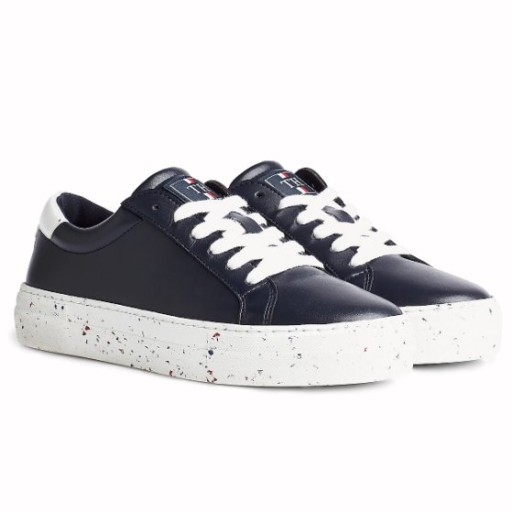 Sneakersy granatowe z białą podeszwą, buty w ponadczasowym stylu, uniwersalne połaczenie kolorów i niebanalne detale - właśnie tak można opisać najnowszą propozycję od marki Tommy Hilfiger. Cholewkę tych butów wykonano z łatwej w utrzymaniu imitacji skóry, która prezentuje się estetycznie i ponadczasowo. Model ten dzięki wkładce uszytej z jakościowego i wytrzymałego materiału - idealnie dopasuje się do kształtu Twoich stóp i zapewni im wygodę. Podeszwa powyższych butów została wykonana z innowacyjnego tworzywa, co nadaje im jeszcze bardziej sportowy i współczesny charakter, a przy tym zapewnia komfort codziennego użytkowania.