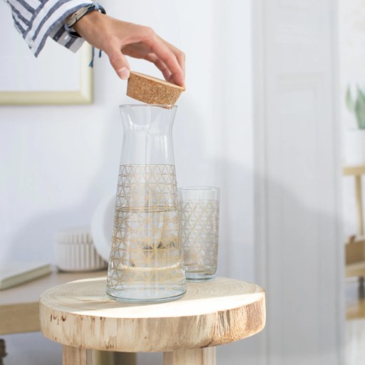 Szklana karafka o smukłym kształcie, zamykana tradycyjnym korkiem, świetnie sprawdza się w codziennym zastosowaniu. Karafka ozdobiona jest dyskretnym złotym motywem. W karafce możemy serwować wodę, soki, mrożoną herbatę czy wino. Można ją również wykorzystać jako wazon do kwiatów.