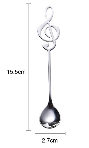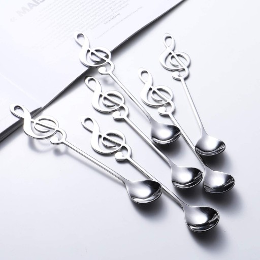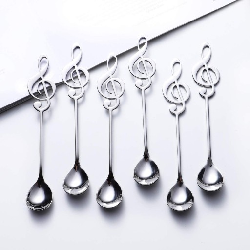 - smukłe metalowe łyżeczki z rączką w kształcie klucza wiolinowego