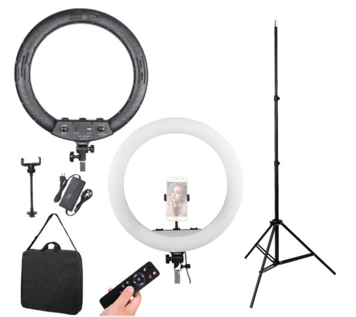 ✅ Duża i wydajna lampa pierścieniowa LED o średnicy 45 cm z płynną regulacją mocy i temperatury barwowej w bardzo szerokim zakresie - od ciepłego światła 2700 K do zimnego 6500 K. Port USB w obudowie pozwala na ładowanie telefonu w trakcie długiej pracy. W komplecie uchwyt do smartfona na giętkim ramieniu oraz pilot do zdalnego sterowania światłem.