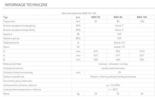 Zbiorniki buforowe BWE przeznaczone są do gromadzenia, przechowywania i przekazywania nadmiaru ciepłej wody grzewczej lub innych płynów dopuszczonych do kontaktu ze stalą uzyskanych z różnych źródeł ciepła: kotłów c.o., kolektorów słonecznych, pomp ciepła, itp.