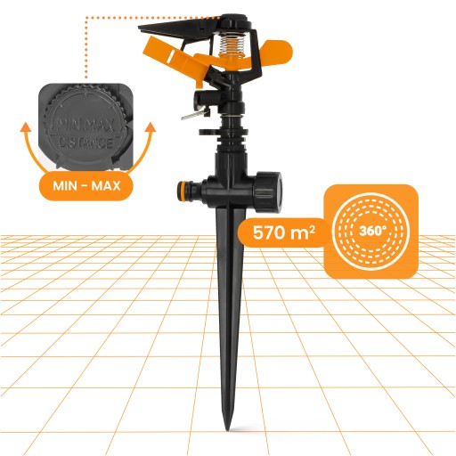 Bardzo dużą zaletą jest przelotowa budowa - dzięki niej podepniesz produkt do innych zraszaczy, tworząc rozbudowany system nawadniania nawet bardzo dużych ogrodów. Jest w stanie zapewnić zraszanie na obszarze 570 m2.