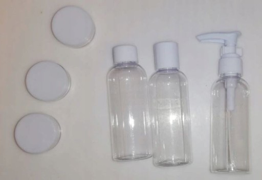 - buteleczki z tworzywa sztucznego do napełniania, pojemniczki oraz butelka z pompką