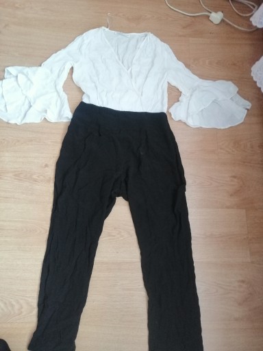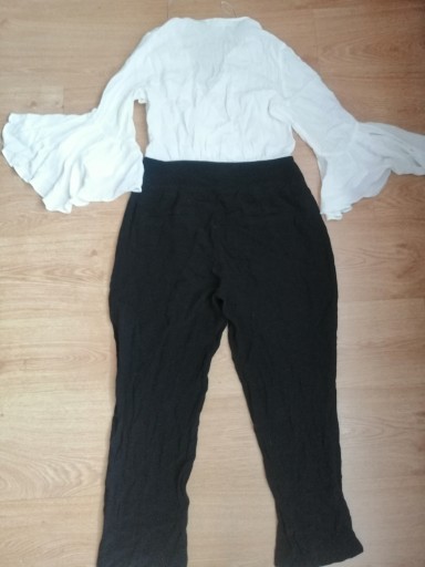 Kombinezon Zara Basic Denim r. M, czarno ecru, elegancki, lekko prześwitujący, nie rozciągliwy, stan dobry, długość całkowita 138 cm, sama nogawka 66 cm, pas 37 cm, biodra 58 cm, rękawy z falbaną, polecam