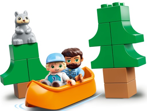 - Zawiera cztery figurki DUPLO® — mężczyznę, kobietę, dziewczynkę i chłopca — oraz kampera z obracającymi się kołami i zdejmowanym dachem, a także materiałowy namiot, kajak i ciekawe akcesoria.