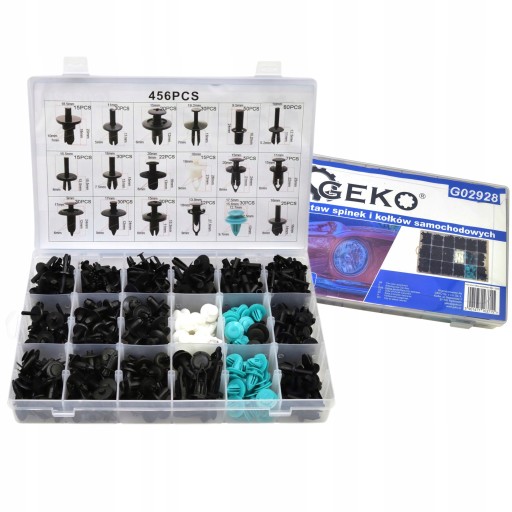 Duży zestaw spinek, kołków rozporowych oraz montażowych stosowanych we wszystkich najpopularniejszych markach samochodów. Zestaw składa się z 456el.